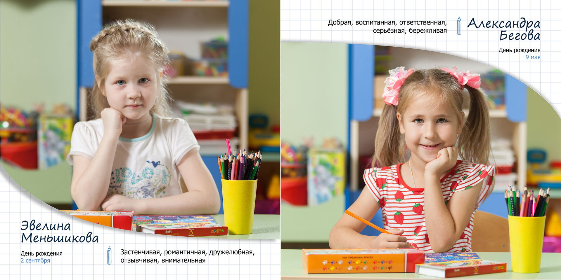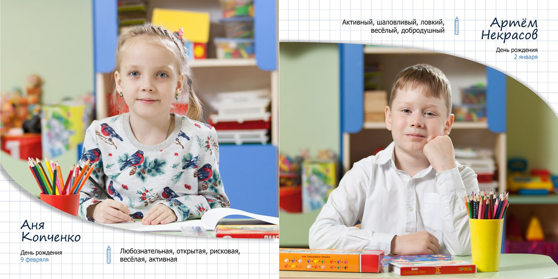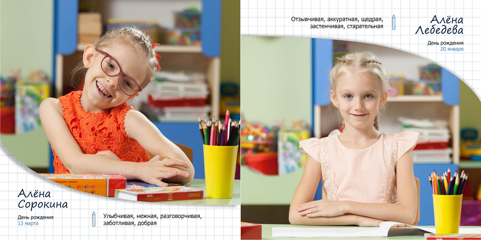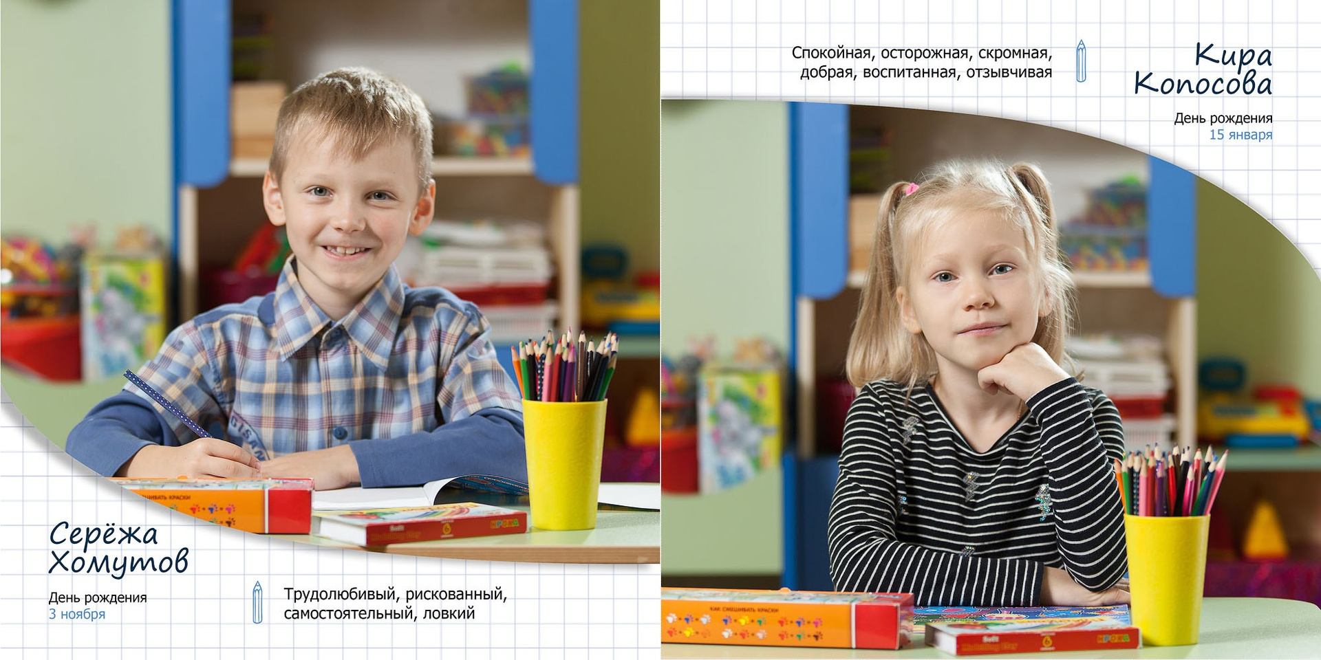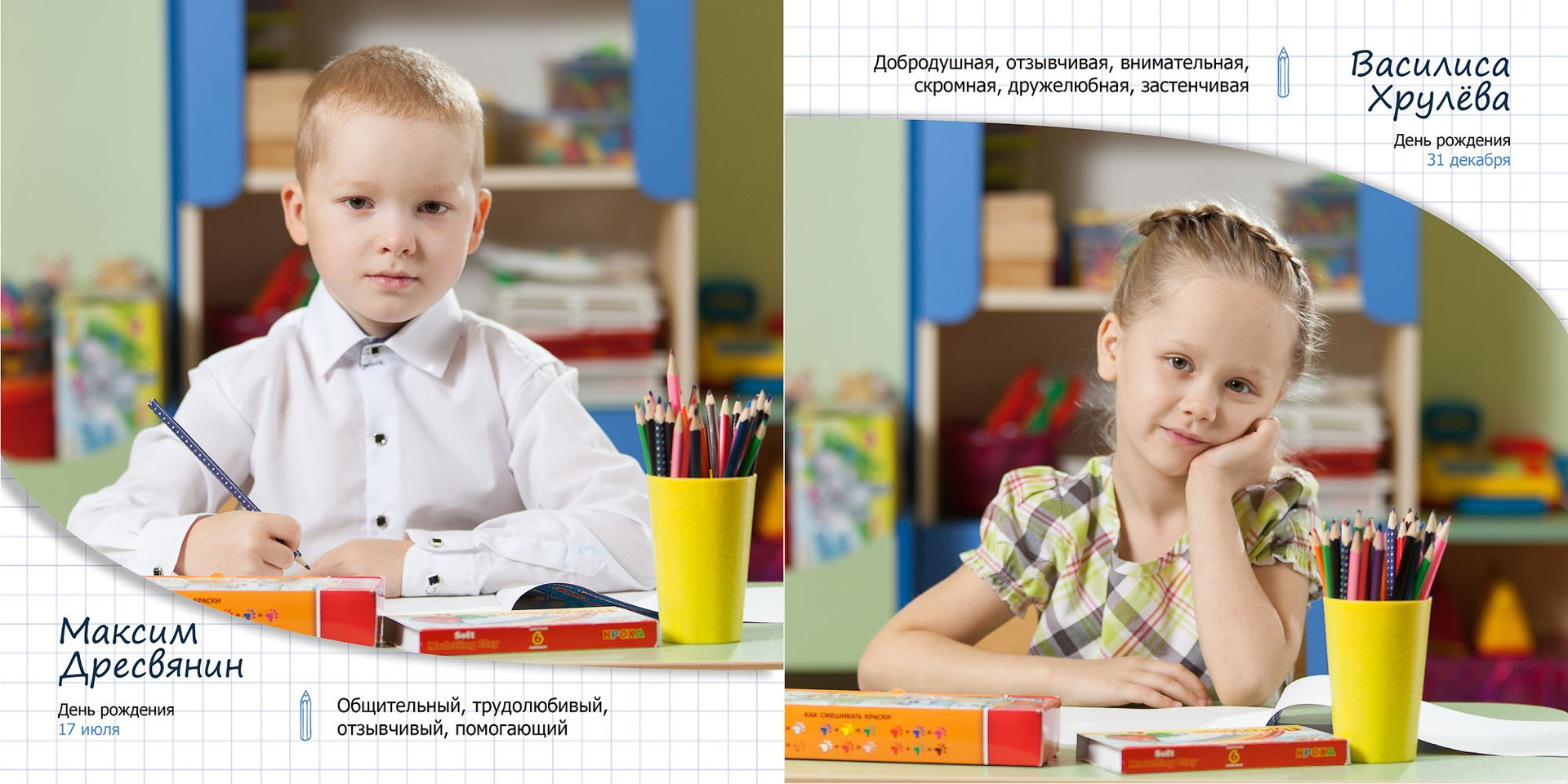 - личные развороты всех одноклассников в разных локациях (страница А4 формата)