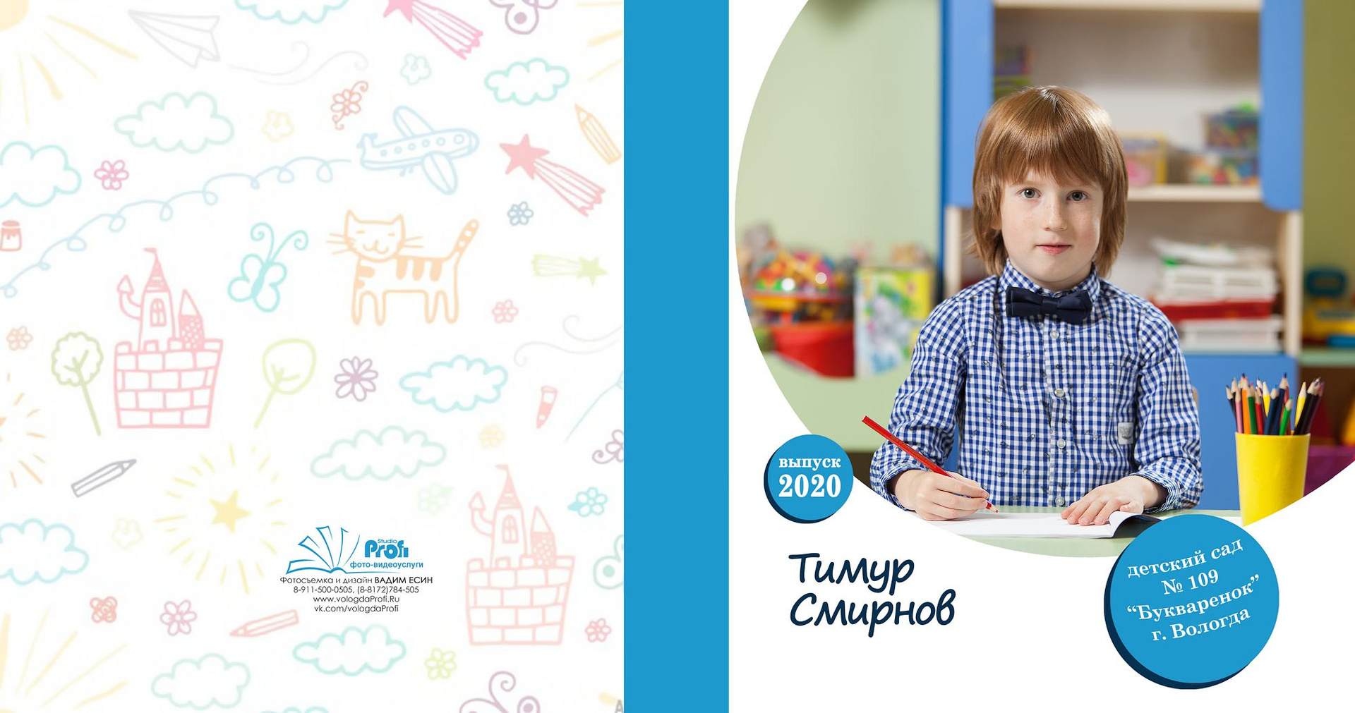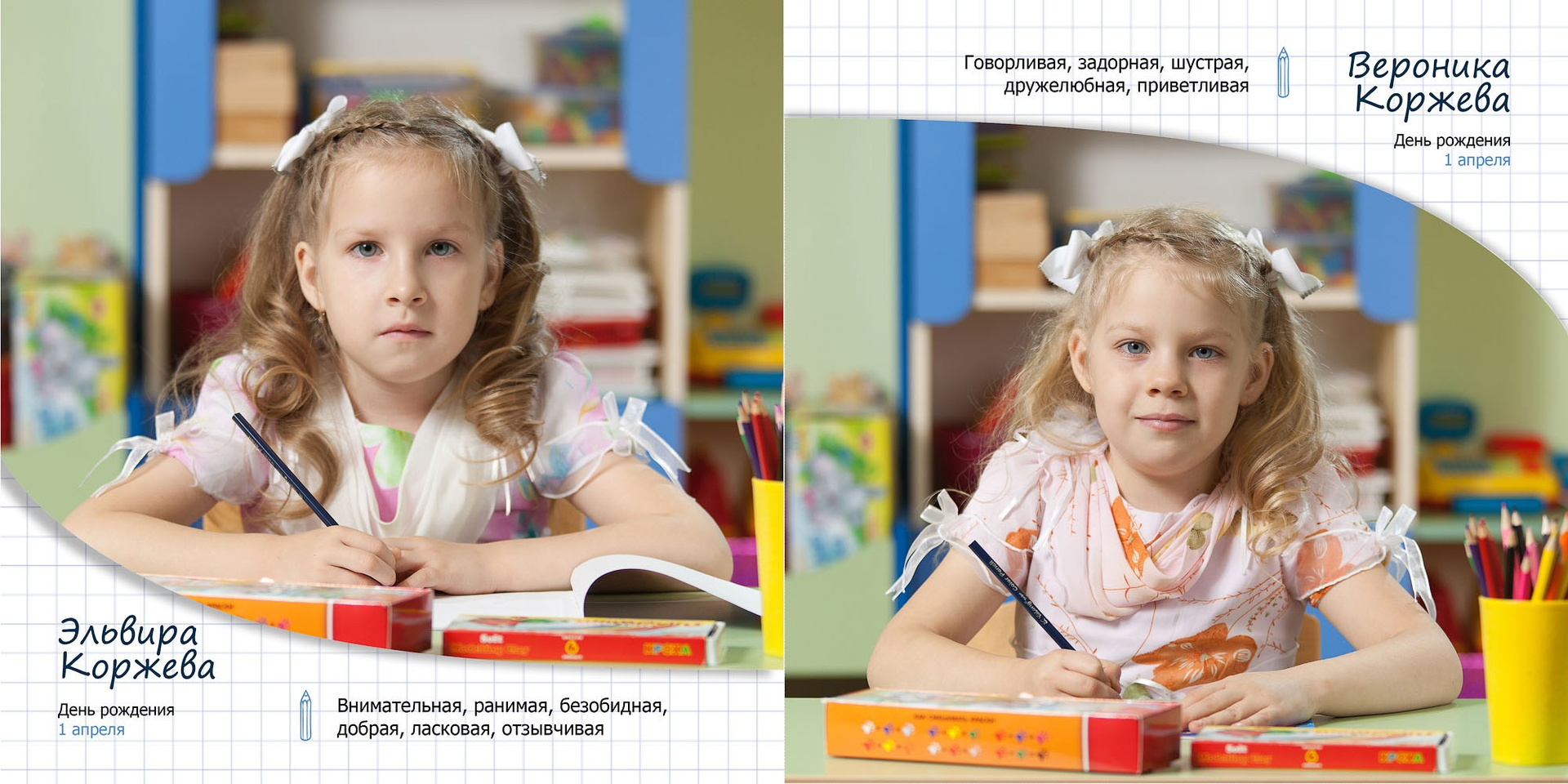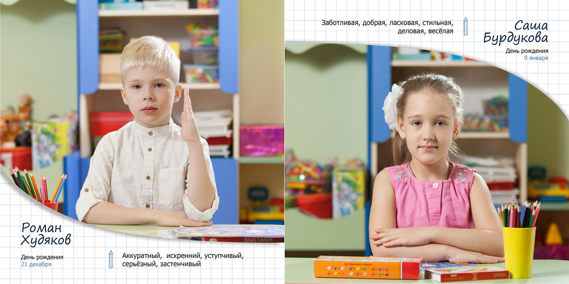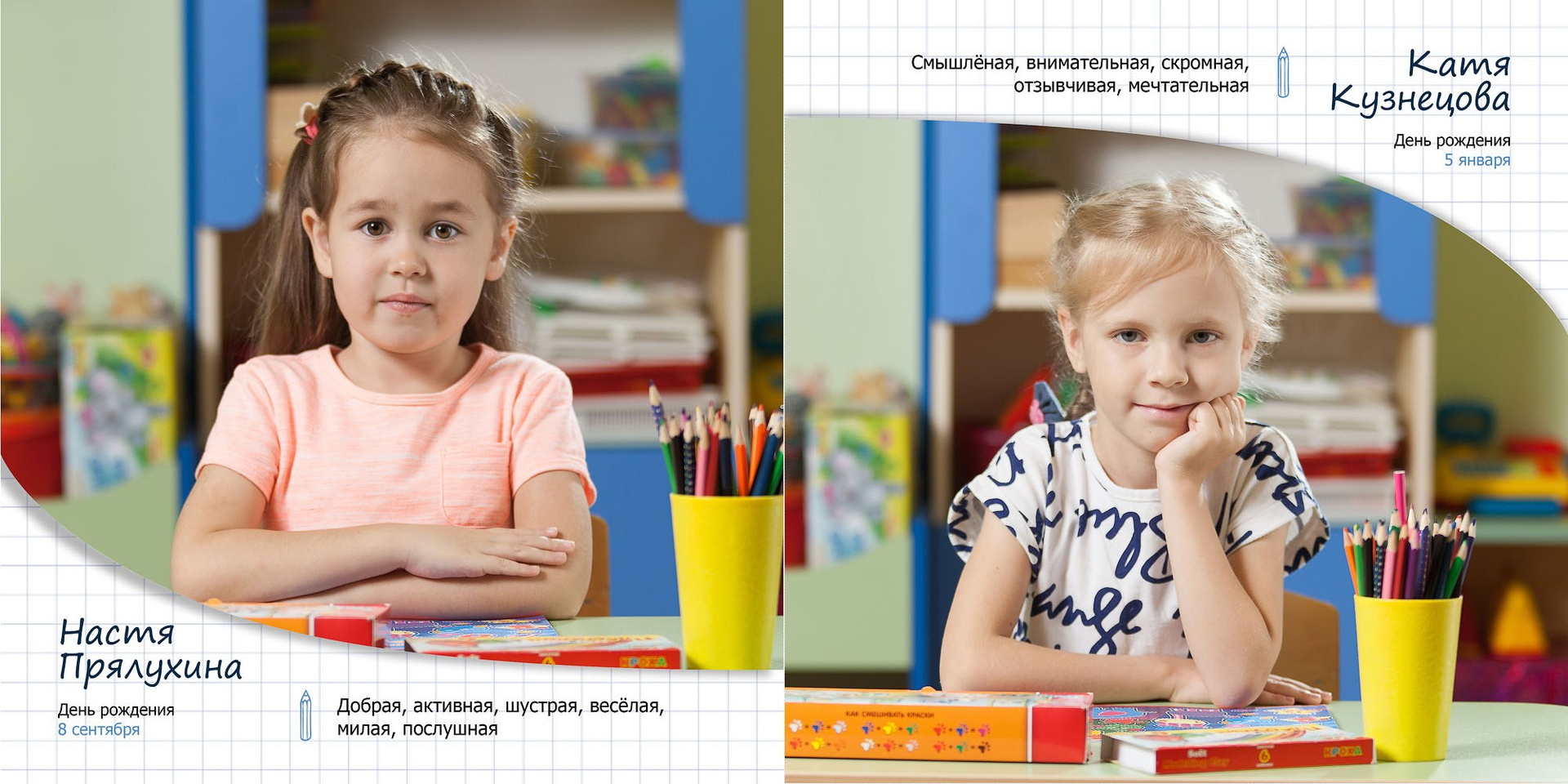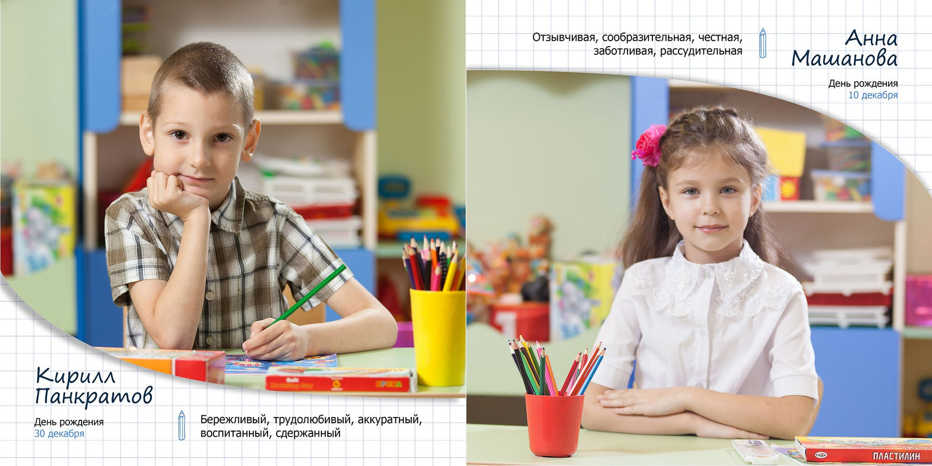 - личные развороты всех одноклассников в разных локациях (страница А4 формата)