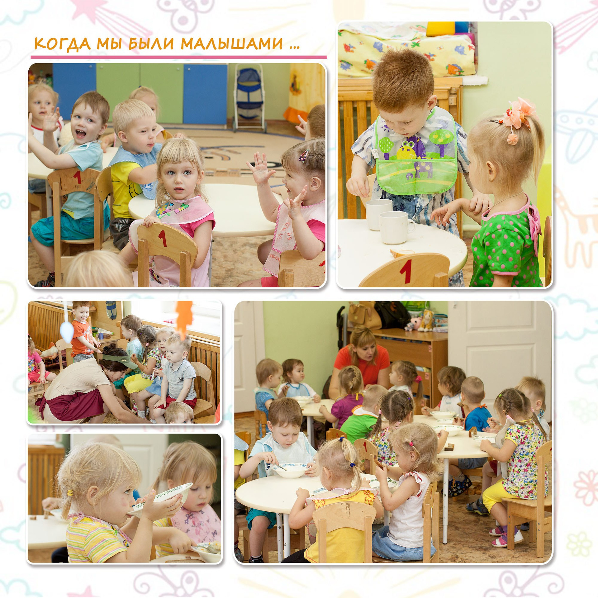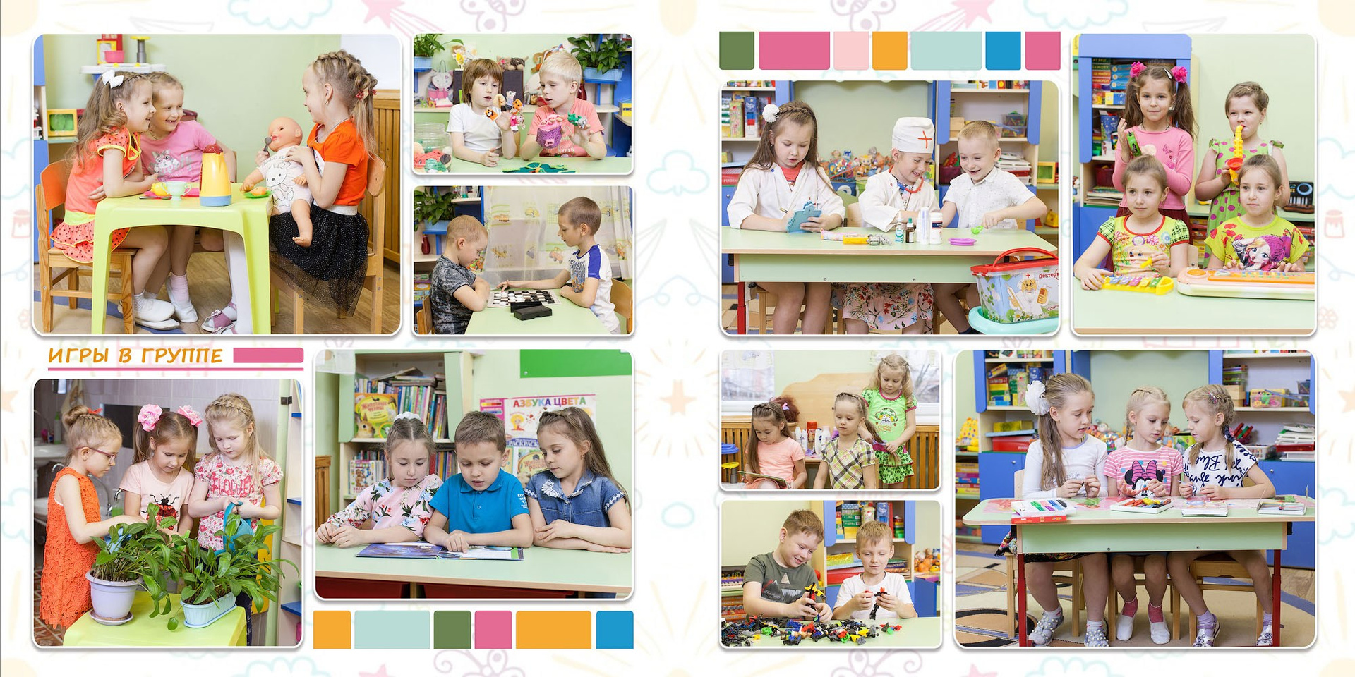 - репортажные игровой разворот и разворот с прогулки (общая фотография-доп. опция).