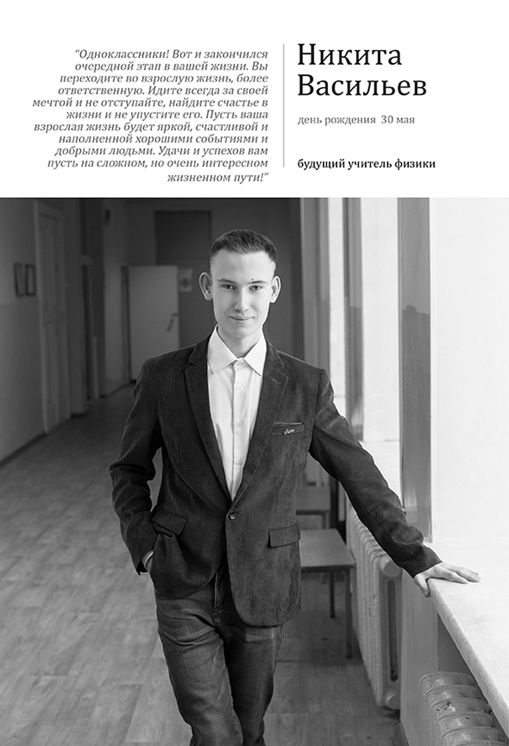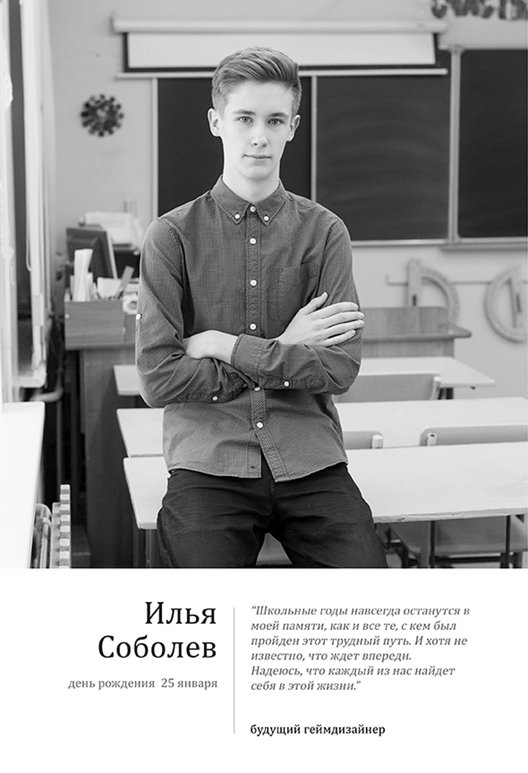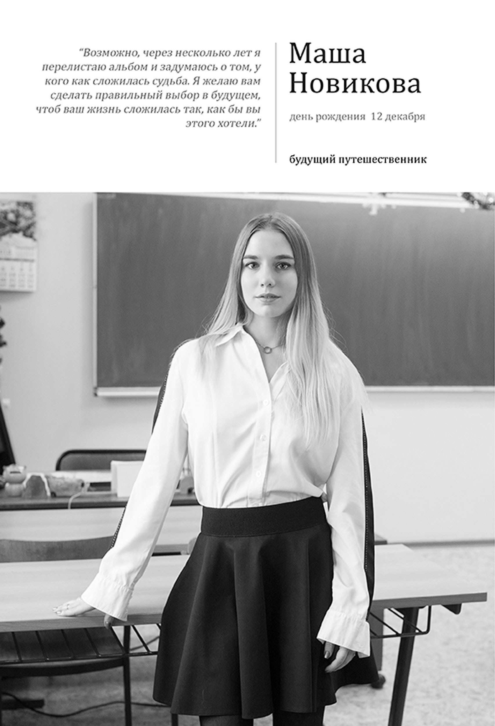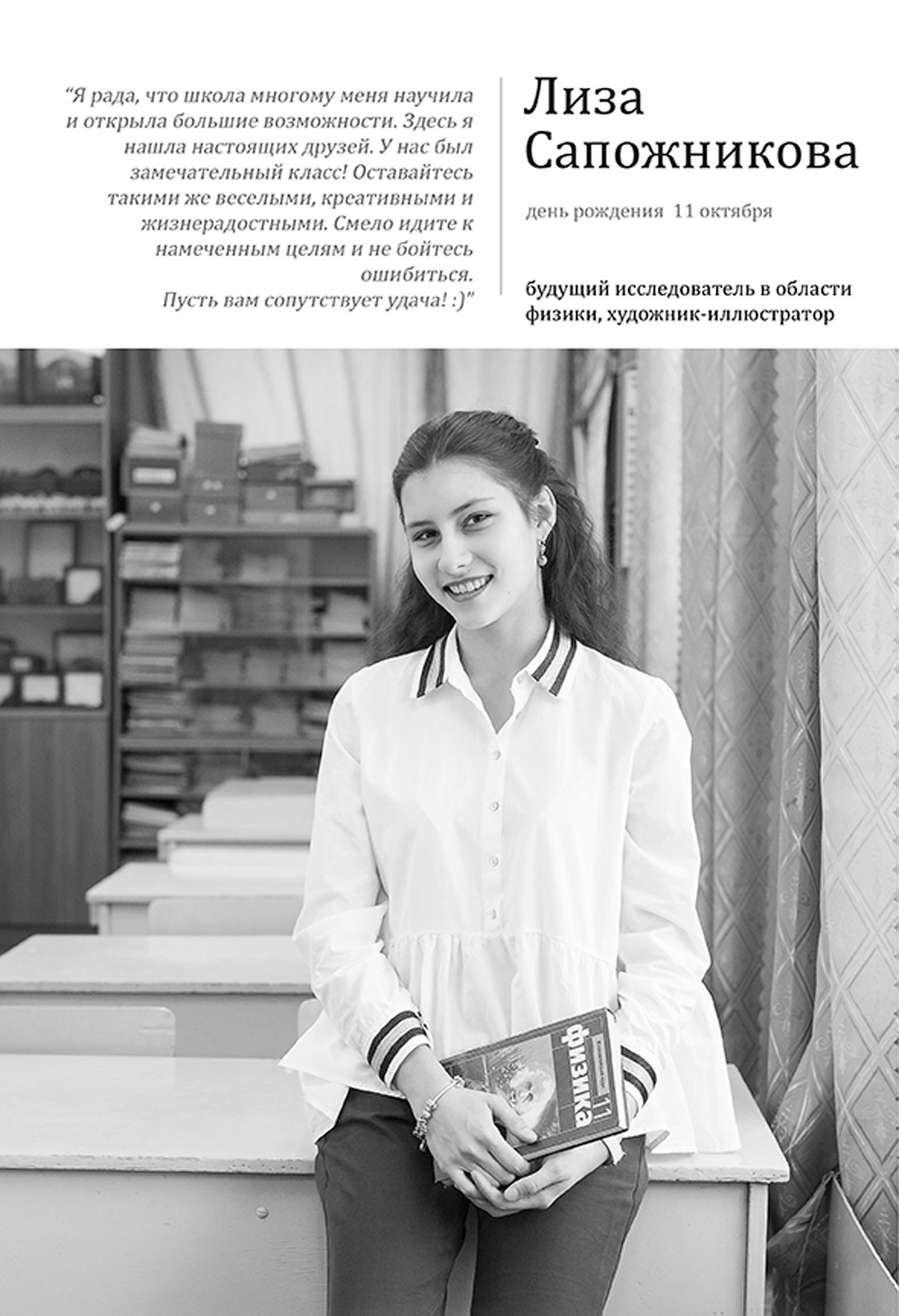 - личные развороты всех одноклассников в разных локациях (страница А4 формата)