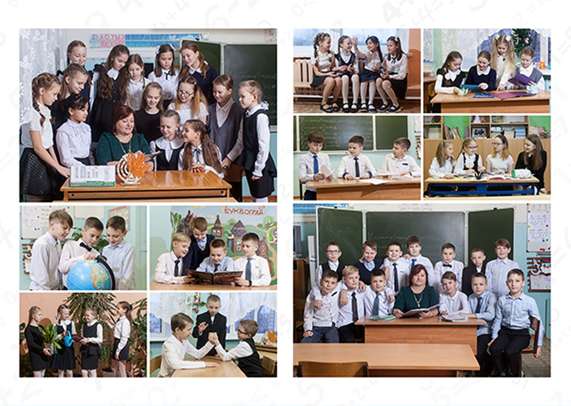 Два разворота (4 страницы внутри), 10 групповых постановочных фото.