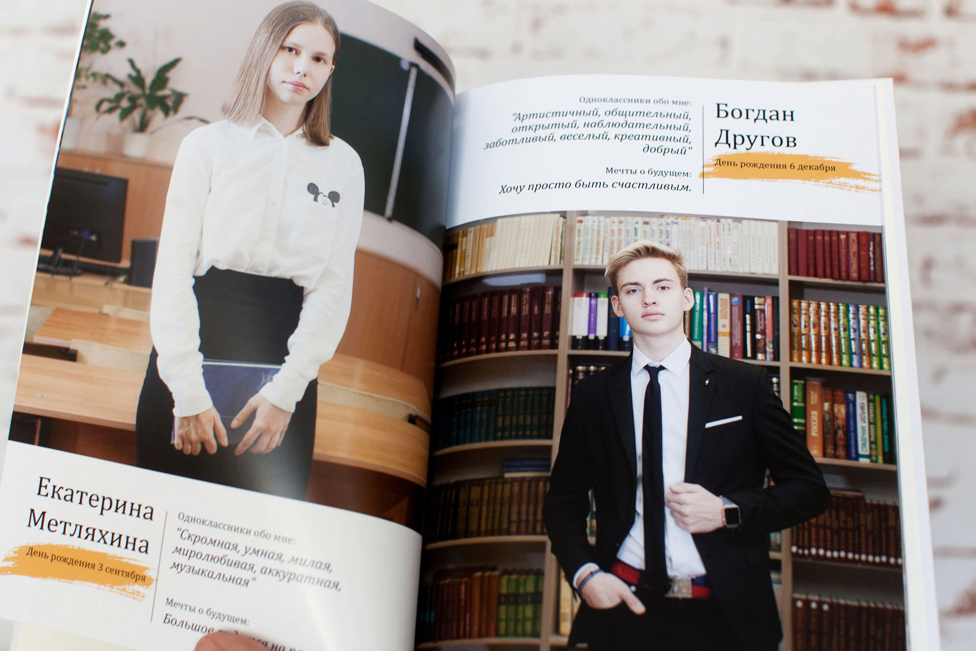 - Гармоничность. Выдержан стиль во всей книге. Выпускная фотокнига выглядит как дорогой глянцевый журнал, только в твердой практичной обложке. Содержание НЕ перегружено лишними незначительными элементами (мультяшки, рюшечки, карандаши, глобусы).