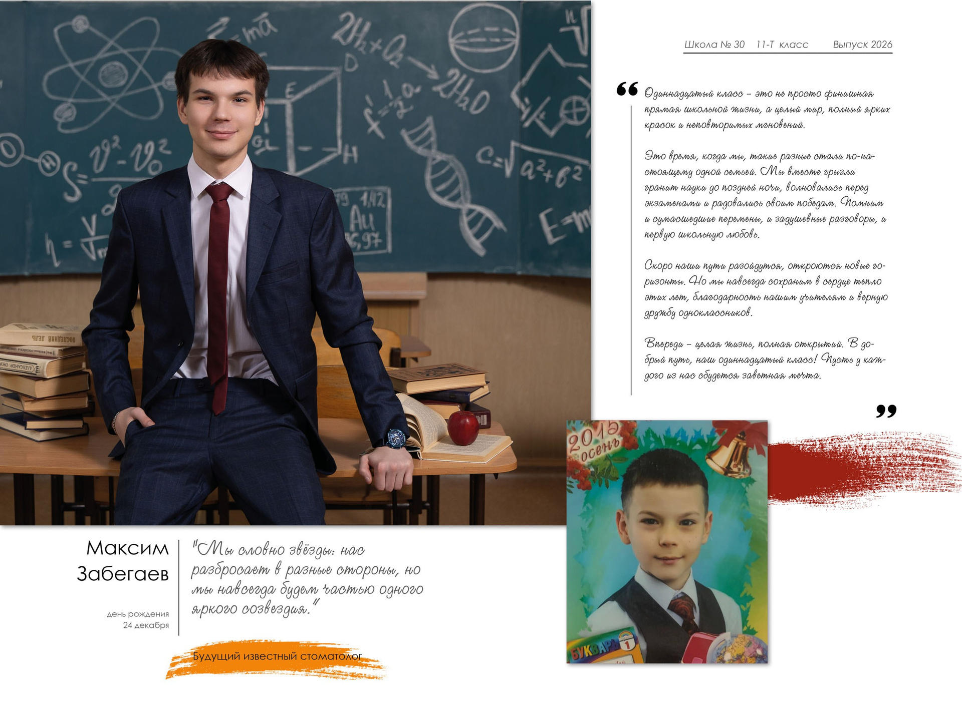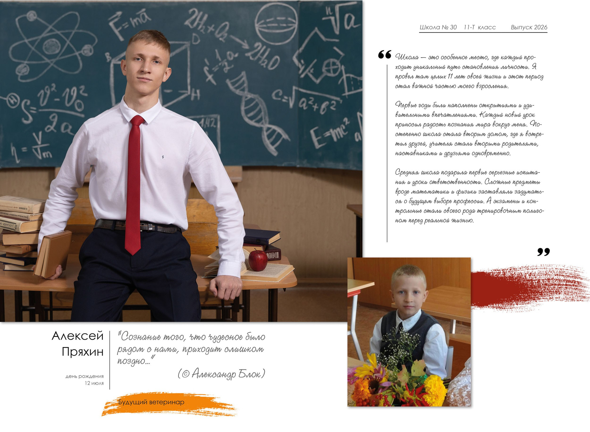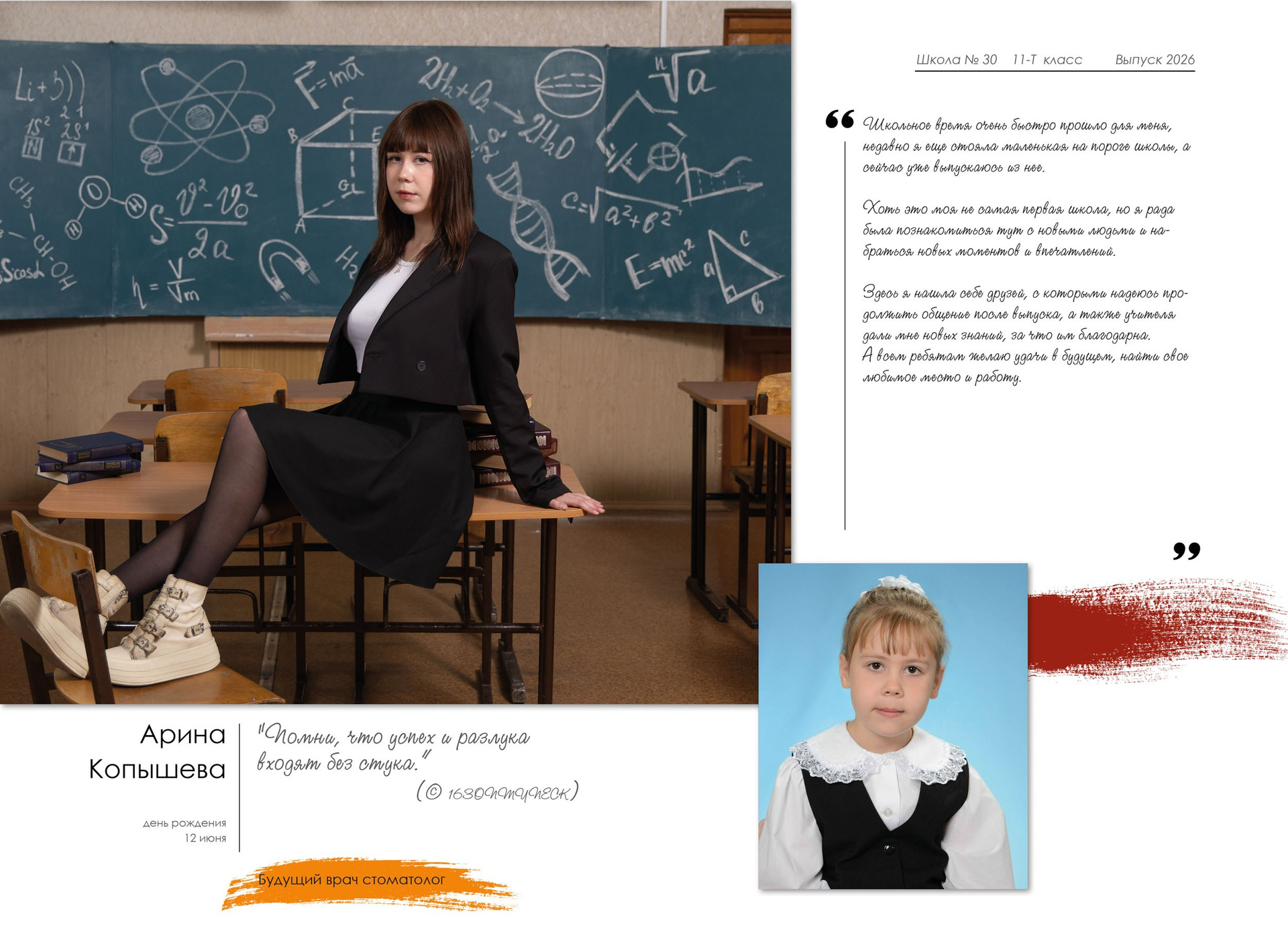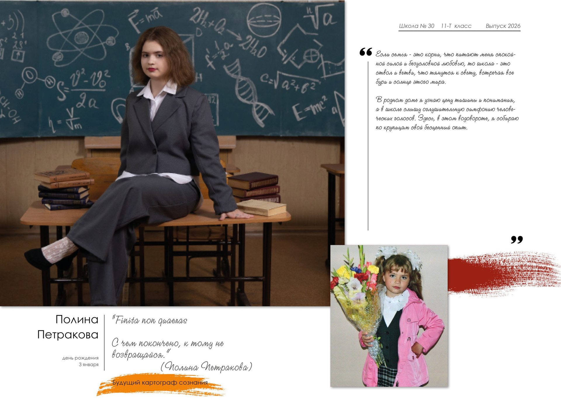 - индивидуальный разворот с личной цитатой, «мини эссе» и фото с 1 класса