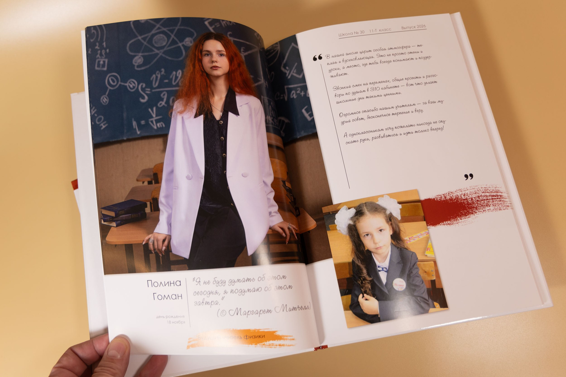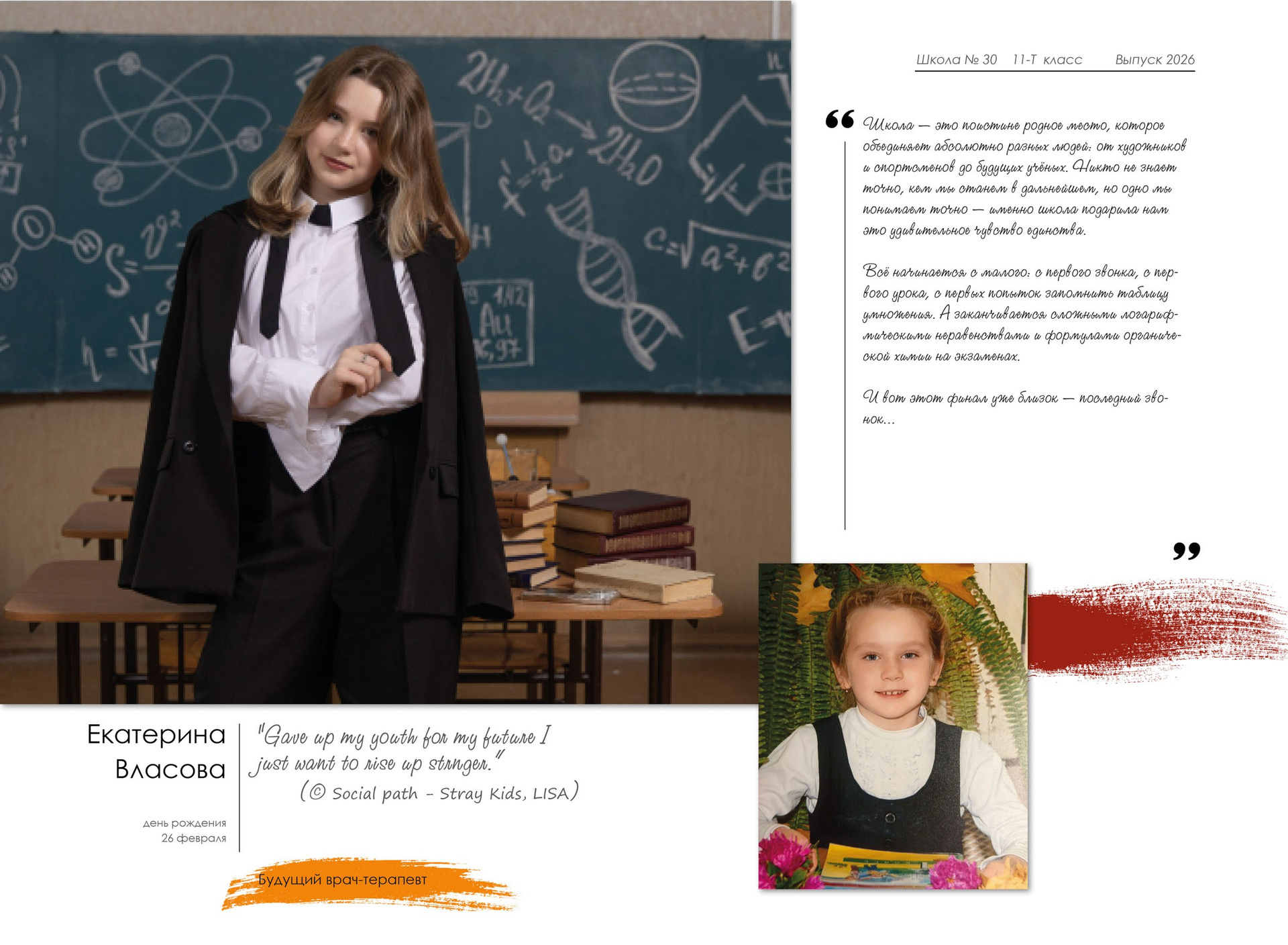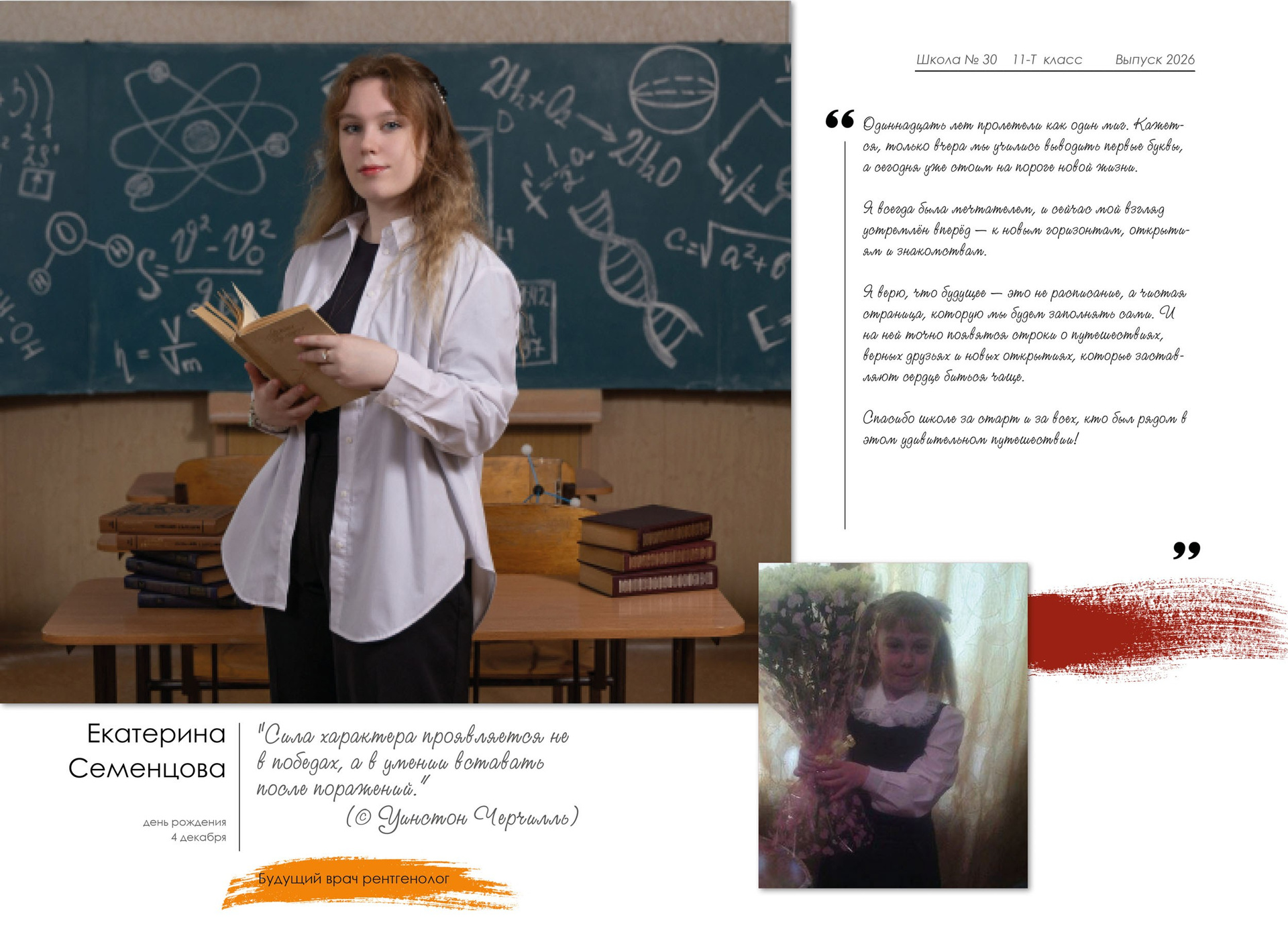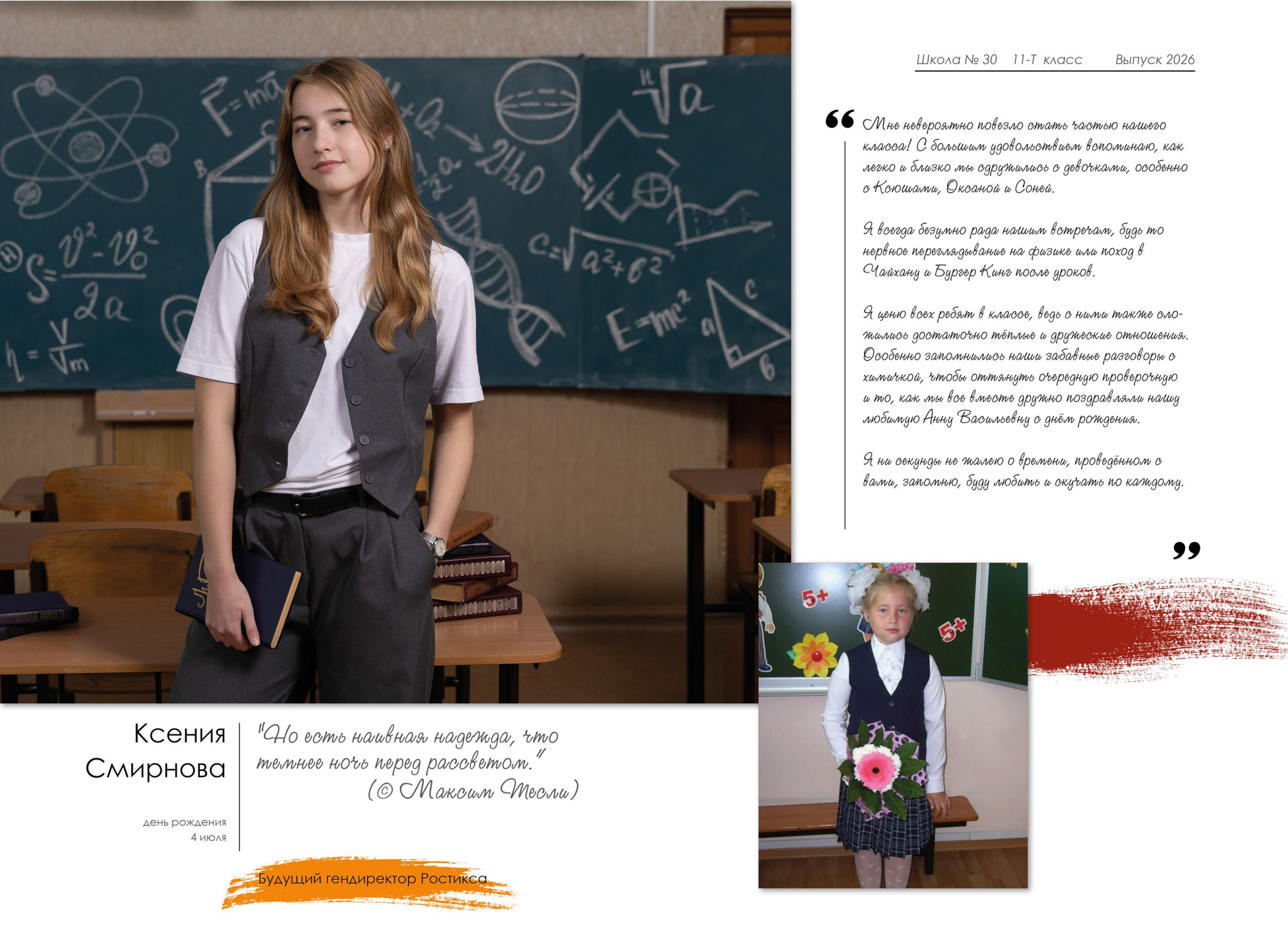 - индивидуальный разворот с личной цитатой, «мини эссе» и фото с 1 класса