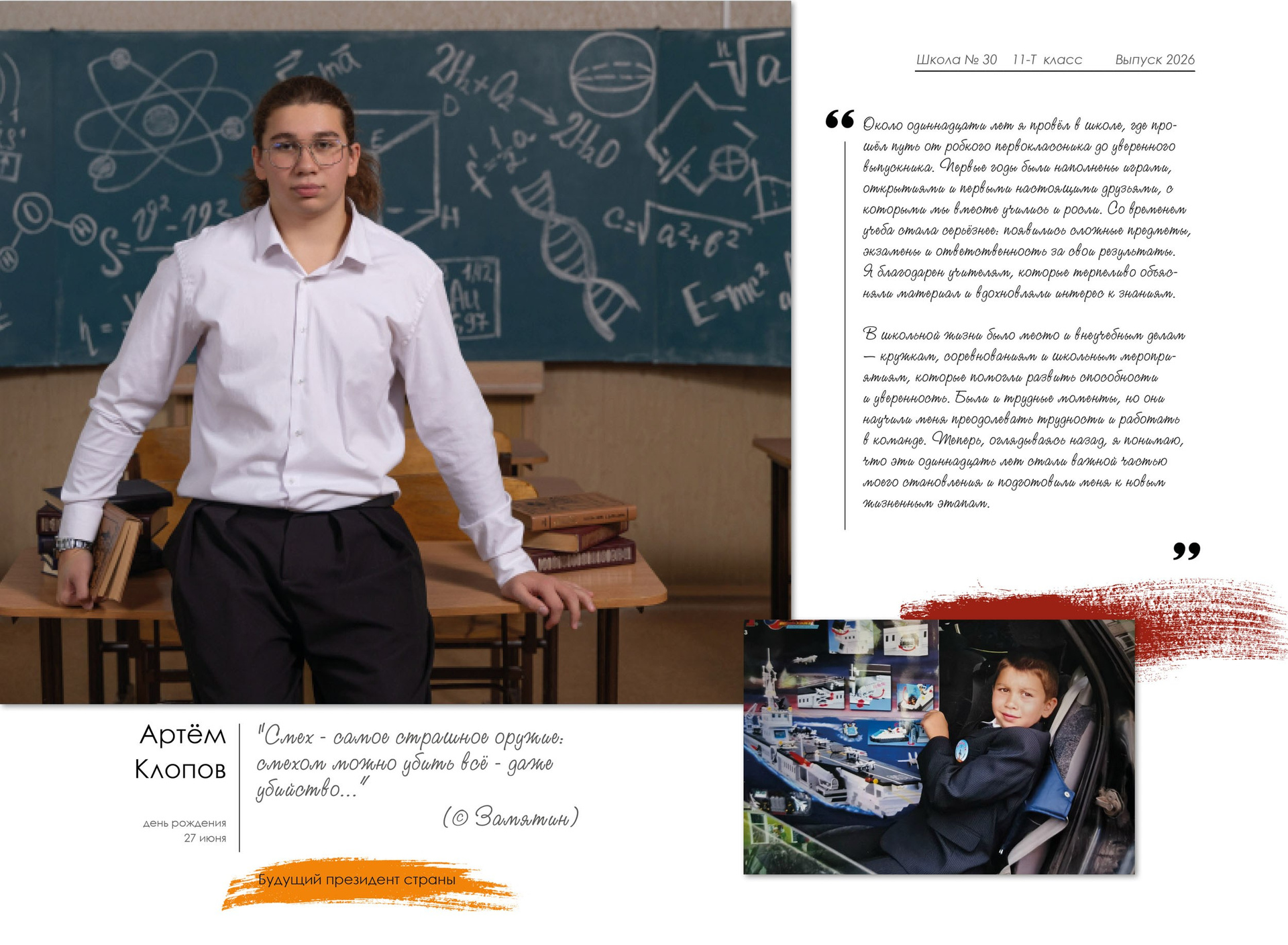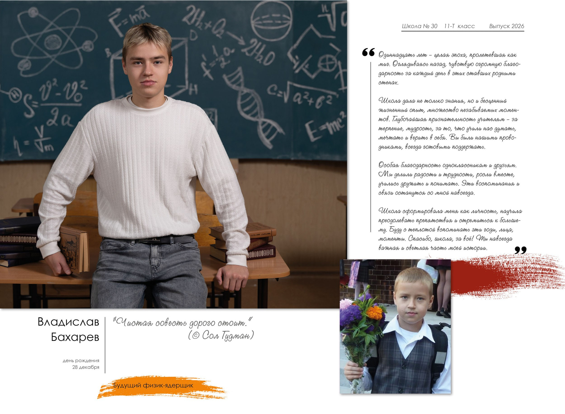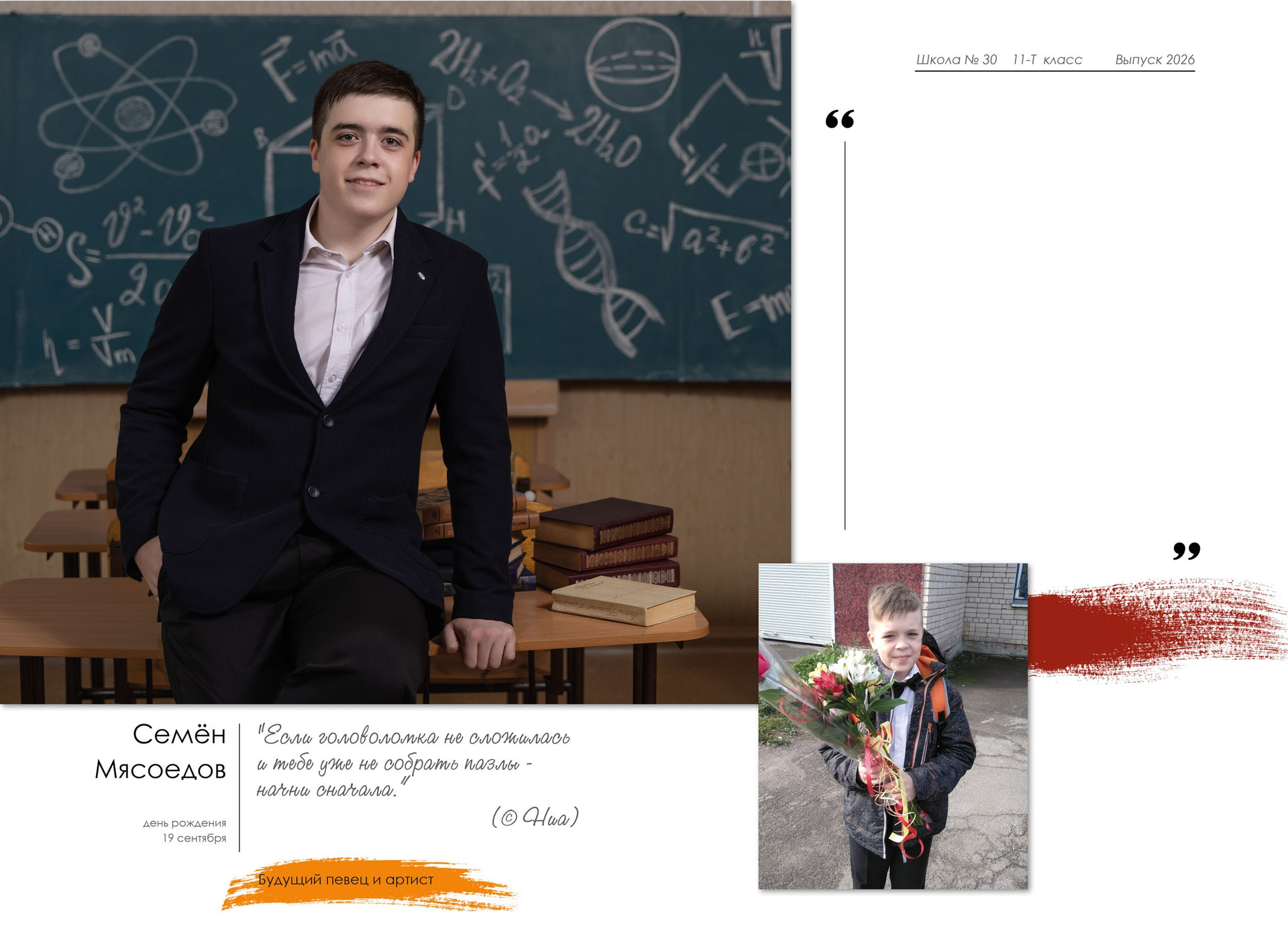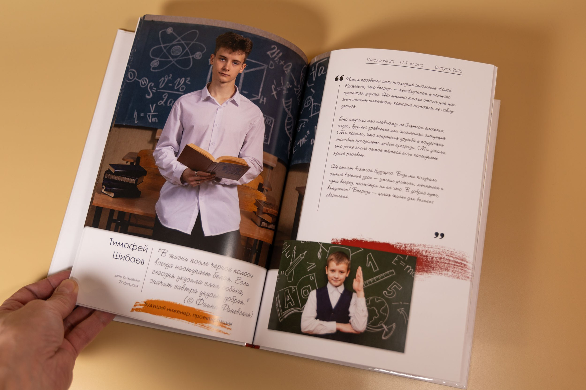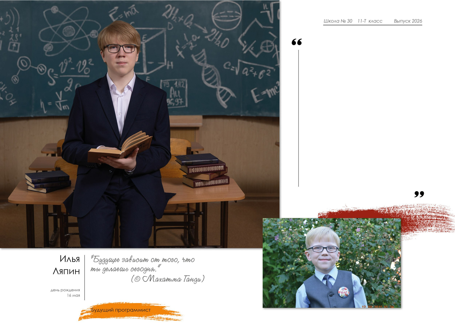 - индивидуальный разворот с личной цитатой, «мини эссе» и фото с 1 класса