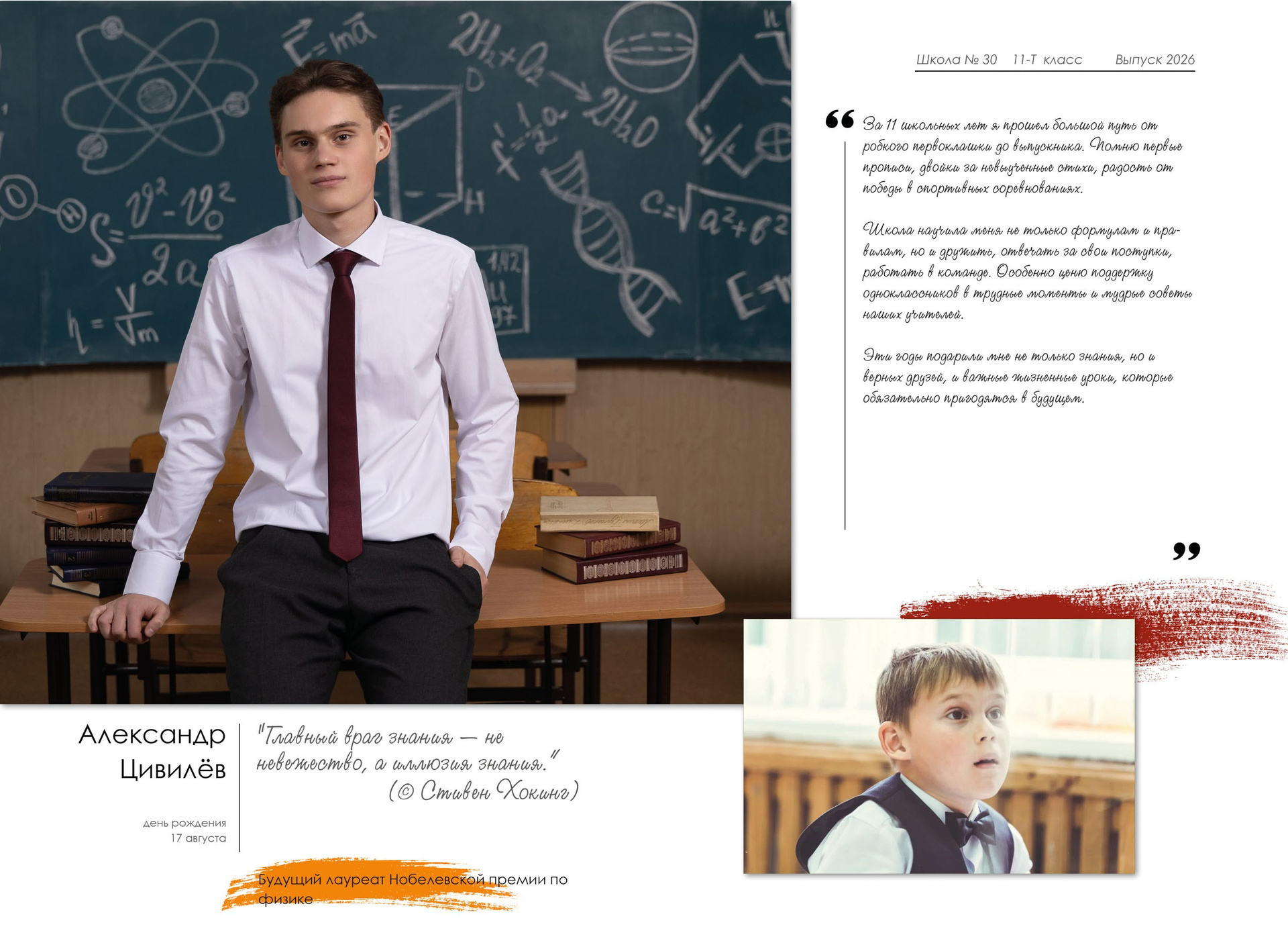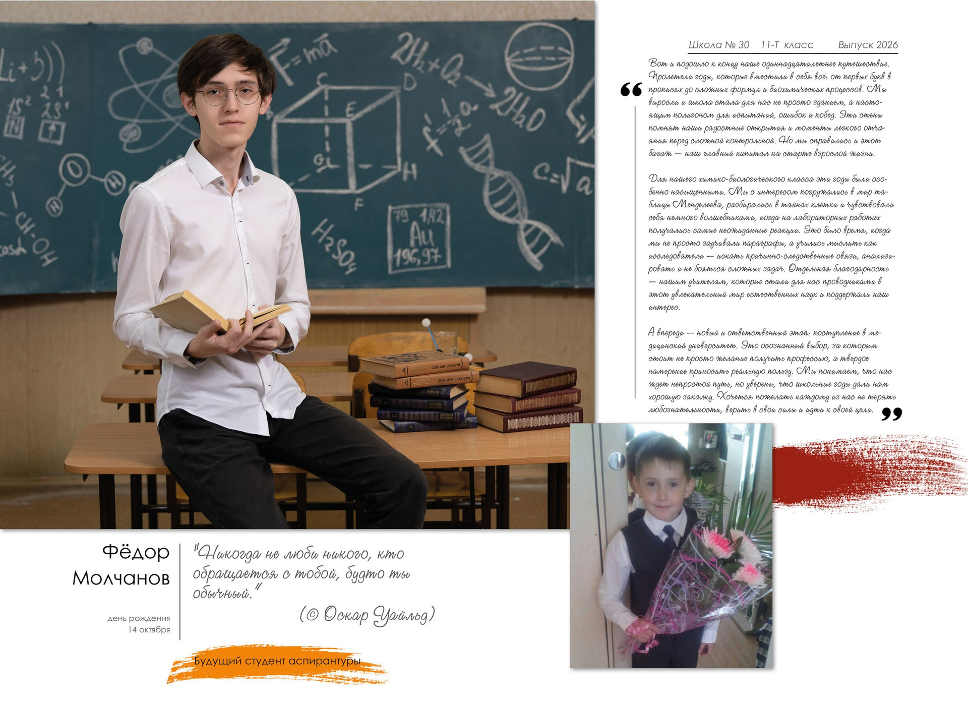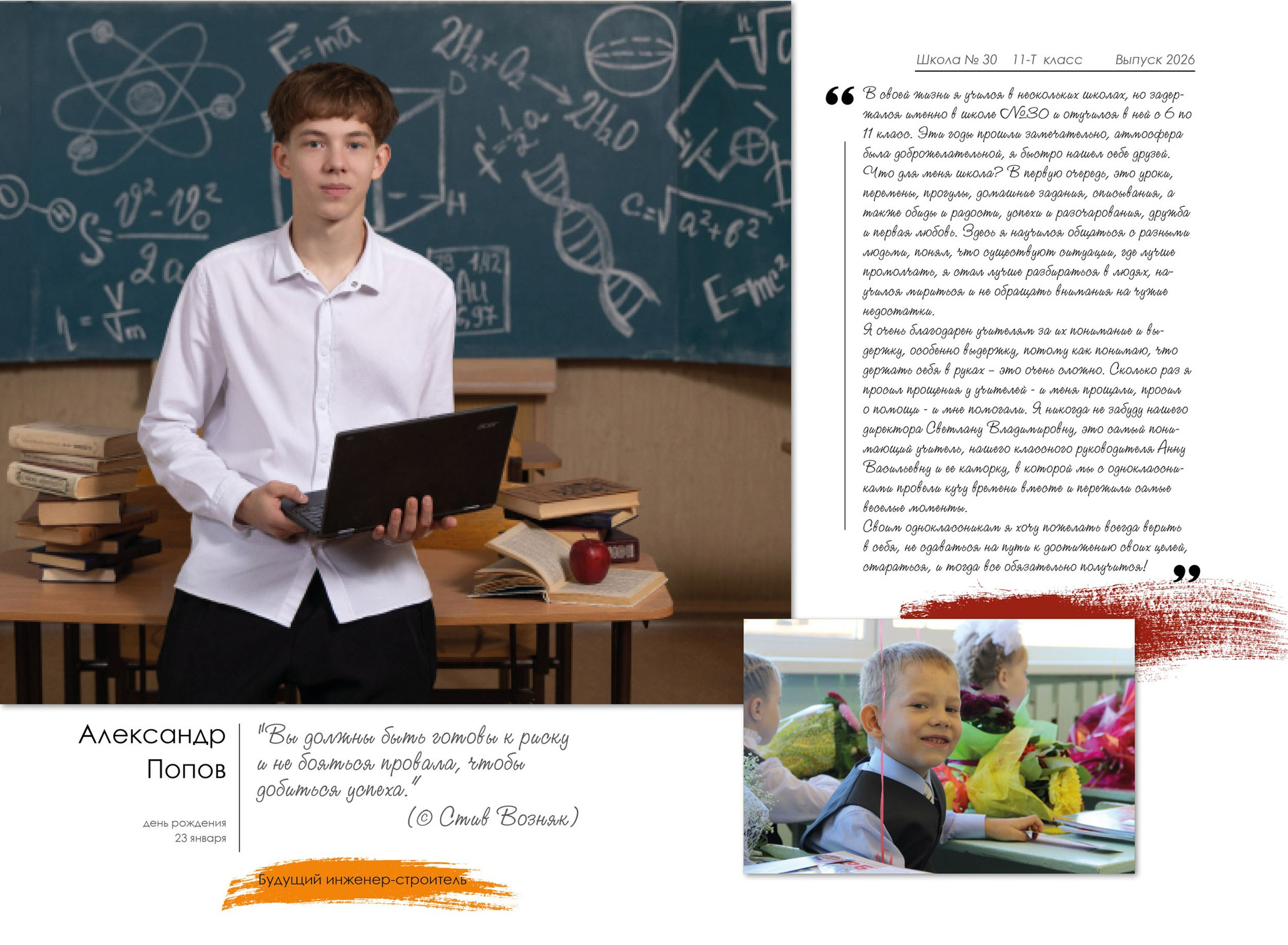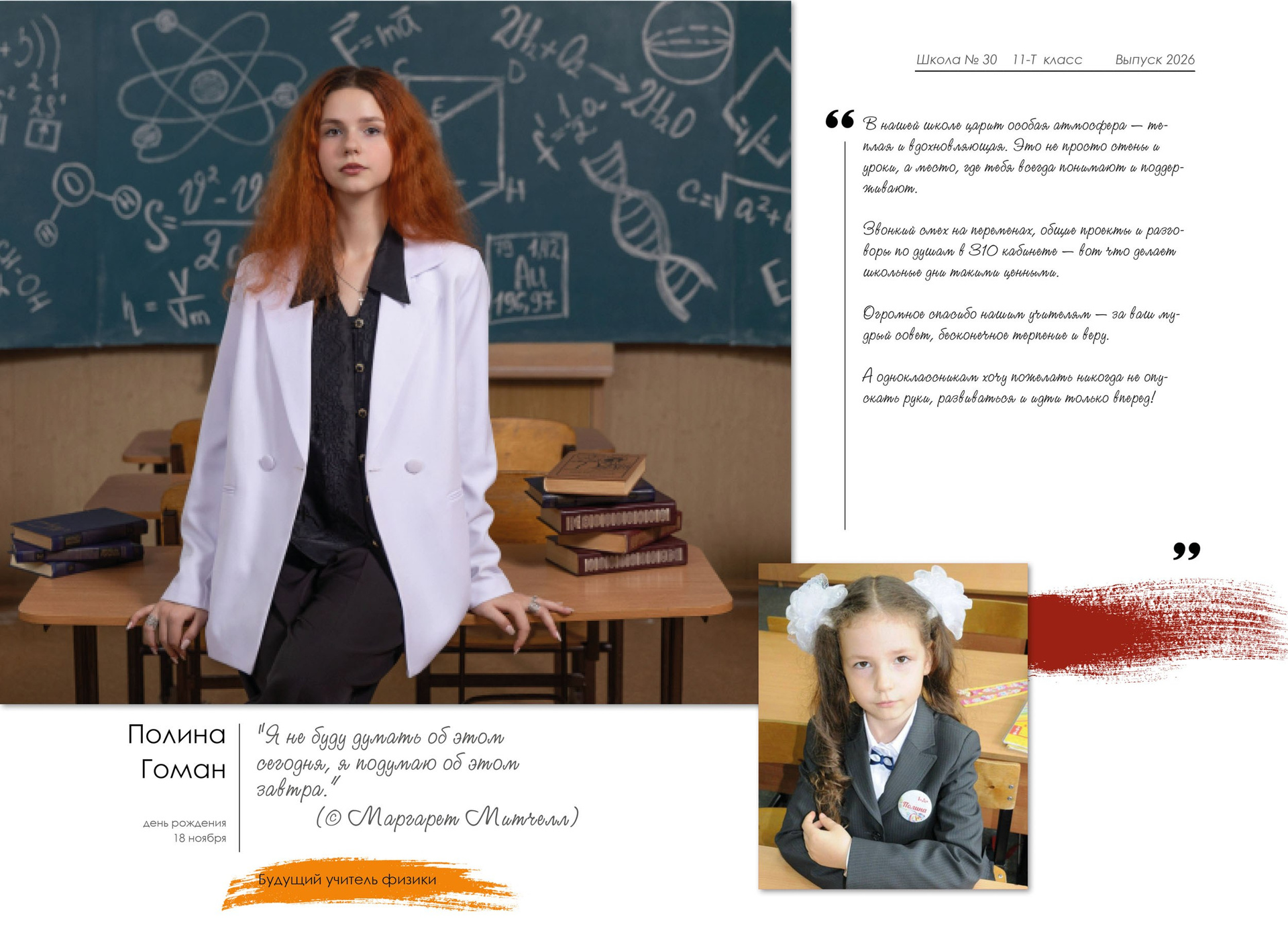 - индивидуальный разворот с личной цитатой, «мини эссе» и фото с 1 класса